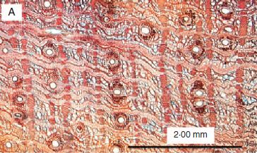 Cross section (stained) of a region of bark from a Boswellia papyrifera tree, from northern Ethiopia.