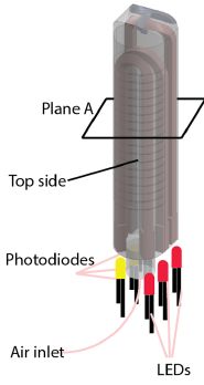 Note the three lights (LEDs, red) at the lower right, and the three detectors (photodiodes, yellow) just to their left. Look carefully, and you will see there is an inverted-U structure from the front LED to the front photodiode. That is a waveguide for the light. In fact, there is such a waveguide between each light and its detector at the other end. The design of the waveguides is such that these fingers can rapidly and sensitively detect small changes in the shape of the finger. Such changes would reflect, for example, touching something, causing deformation of the finger. The waveguide at the finger bottom (or "back", in the figure) has a special role. It is on the palm side. This waveguide is in the position to sense touch at the finger tip. Ignore "plane A" for our purposes. The full figure shows a cross-section of the finger at this plane. This is part of Figure 1E from the article. |