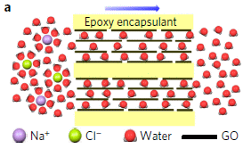 What are these membranes? The scientists used laminated graphene oxide (GO). People have tried that before, but, as we noted above, the material tends to swell in water; when swollen it allows the salt to pass. What they did here was to block the swelling.