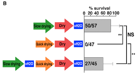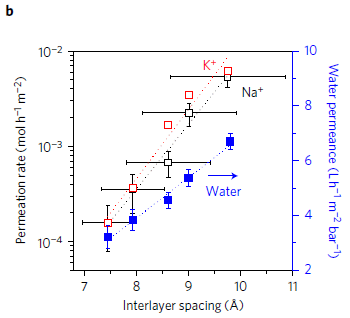 The third line, with blue symbols, is for water. At first glance, the water line may seem to be only a little less steep than the Na+ line. However, we need to look more carefully at the axis scales. The data for the ions use the y-axis scale on the left; the data for the water use the y-axis scale on the right. It's common to make a graph with multiple y-axis scales, but in this case, there is something special: the left scale is a log scale; the right scale is linear. To get a feel for the effects, look at the difference between the results for the smallest and largest inter-layer spacings. For Na+, the rate increases by about 30-fold; for water, it increases by about 2-fold. More relevantly, look at it "backwards", from right to left... As the spacing becomes smaller, the rate of ion flow is reduced much more than the rate of water flow. That is, as the spacing becomes smaller, there is better separation of the water from the ions. That's exactly what we want. Don't try to compare the rate numbers for water and ions. They are measured in different ways. This is Figure 2b from the article. | |