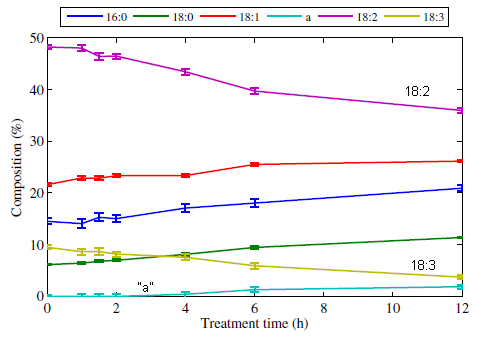 The fatty acids listed here are the five major ones in soybean oil; their structures are shown in the previous post. Two of the curves decline over time. These are the curves for the polyunsaturated fatty acids (18:2 and 18:3). |