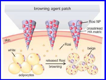 A new article explores a way to exploit beige fat. The scientists have a drug that stimulates the conversion of ordinary white fat calls to beige fat cells. They deliver the drug, locally, through the skin by use of a microneedle patch. They then observe what happens.
