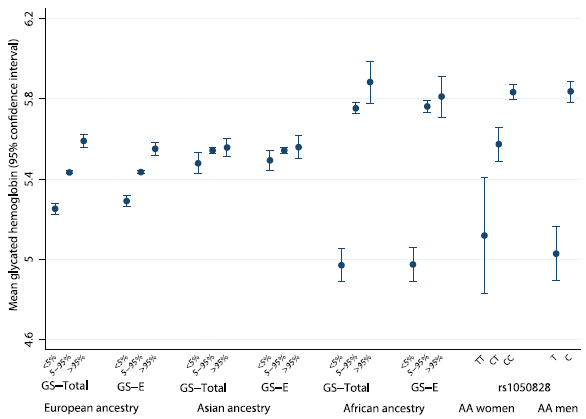 The x-axis is labeled by ancestry and GS. The GS is the genetic score, a measure of how many genetic variants the person has that seem to have some effect on the glycation level. To get the idea of the graph, look at the first group of measurements, at the left. These are for people of European ancestry. The three points are for the lowest 5% of the distribution, the middle 90%, and the top 5%. The values for glycated hemoglobin range from about 5.2 to 5.6 for these points. This shows that genetic variation does affect the level of glycation. The second group of three points is for a sub-population of those of European ancestry. The results are similar. The next two groups of data are for people of Asian ancestry. For these people, the range of values is smaller. And now, the "important" part... The next two data sets are for people of African ancestry. There is a now a very wide range of values. In particular, the scores for the lowest 5% of those of African ancestry are very low compared to the scores for the other groups. This is Figure 5 from the article. |