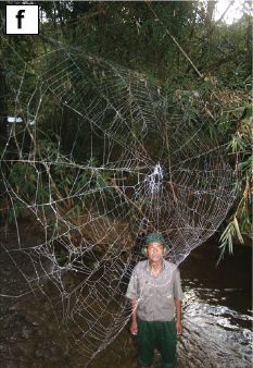 Most web... As much as 2.8 square meters. Made by a Caerostris darwini, Darwin's bark spider. The creature at the bottom is presumably about 2 meters tall -- or at least was before the photographer truncated him. The spider? Don't know if it is visible in there. However, there is one featured in part e of the full figure in the article. This is Figure 3f from the article. |