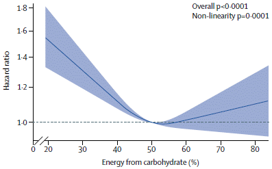 The blue line shows the best fit to the data; the shaded band shows a confidence interval. (It's probably 95%, but that isn't clear.) The picture is clear: There is an optimum, at about 50% carb. Mortality is higher at either higher or lower levels of carb. This is Figure 1 from the article. | |