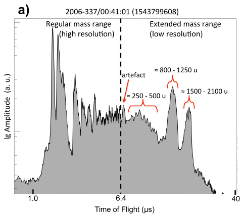 The emphasis here is on finding high molecular weight material -- "macromolecular organic compounds", as the authors say in the title of the article. What are these compounds? They don't know. The high-mass part of the spectrum (to the right of the vertical dashed line in the figure above) is obtained at low-resolution; exact mass information is not available. However, for the lower mass part of the spectrum (to the left), there is a series of peaks that are about 13 u apart. That suggests almost pure carbon, with a very small amount of hydrogen. Something like benzene, or larger compounds of similar structure.