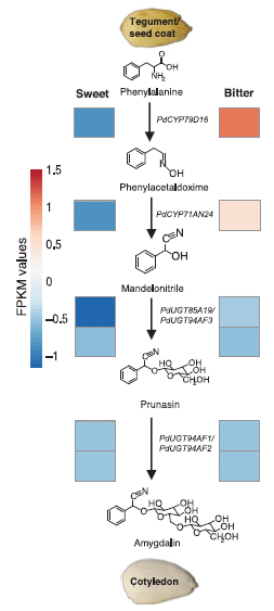 The genes for the enzymes that carry out those steps are all known. What is shown here is the level of those enzymes in the two types of almond. Actually, what is measured here is the level of the messenger RNA for the enzymes; that is often (but not always) usefully related to the enzyme level. That level is shown by the color-coded boxes; there is a color key at the left, labeled FPKM. You can see that the boxes for the last two steps are about the same for the two almond strains. But for the first two steps; the bitter almonds have red boxes, and the sweet almonds have blue boxes. Check the color code, and you see that the sweet almonds have very low levels of the enzymes for the first steps in making amygdalin. This is Figure 2 from the article. |