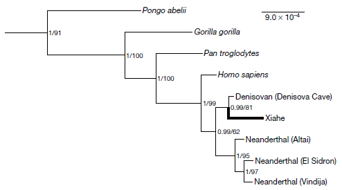 That's a genealogy chart of several hominids. You can see that the Xiahe specimen (thick line) clusters close to the Denisova Cave sample.