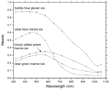 Spectra. Albedo spectra. Albedo refers to the fraction of light reflected. An object with high albedo reflects a lot of light. (Albedo = 1 means total reflection. Albedo = 0 means no reflection; the object is dark.) The scientists are measuring the spectra for light reflected from various kinds of iceberg ice. You can see that the two ices labeled as blue (top two on the left, where they are labeled) reflect mainly light with short wavelength: bluish light. For the two ices labeled as green, much of that blue light has also been removed. The green ices reflect less light, and it is more spread over the entire spectrum, with a slight peak in the middle. This is Figure 7 from the article. |