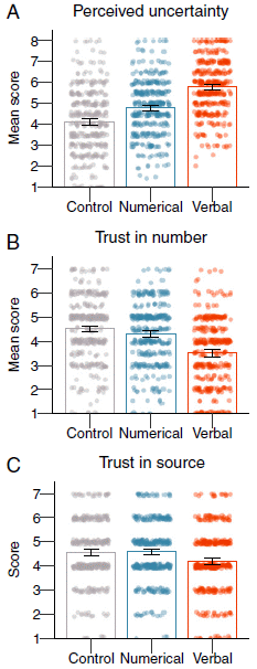 Part A shows how the respondents rated the uncertainty. About 4, on average, for the control statement, and about 5 or 6 for the statements that included an explicit statement about uncertainty. That is, the respondents noticed the explicit uncertainty.