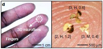 At the left, the white arrow points to them. At the right is a higher magnification view. Each microflier is labeled to describe the type. For example, the one at lower right is labeled [3, M, 0.4]. That means three wings, membranous wings, and an aspect ratio (height to width) of 0.4. Note the scale bar: 500 µm = 0.5 millimeter. This is Figure 1d from the article. The next part of the full figure shows 100 of them. |