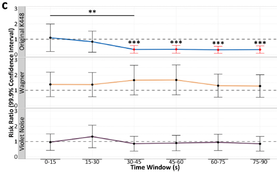 Each narrow bar is for a pair of sites considered similar except for the lighting. The bars are grouped by the type of lighting, and by the type of landscape. A specific example... The first group of narrow blue bars at the left compares sites with LED lights vs similar unlit sites; the sites here are all with hedgerows. Each bar shows the ratio (caterpillars in lit site)/(caterpillars in unlit site); low values mean that there were fewer caterpillars in the lit area. You can see that all six (narrow) bars in that part of the figure are like that. The next bar -- same color, but wide -- shows the average for that set. In fact, the general pattern is the same for all the data sets: fewer caterpillars with lighting. The data sets to the left of the vertical dashed line for are sites with hedgerows; the data sets to the right are for sites with grass. Lighting groups are LED (light-emitting diodes), HPS (high pressure sodium), and LPS (low pressure sodium -- on the right side only). The article contains statistical analyses of these data. This is Figure 1 from the article. |