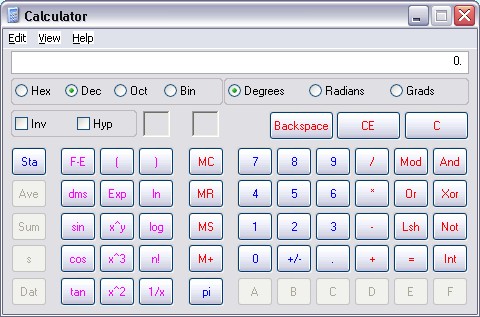 Picture of Windows Calculator, in "scientific" mode [link opens in new window]. (Screen shot provided by the author of this page.)